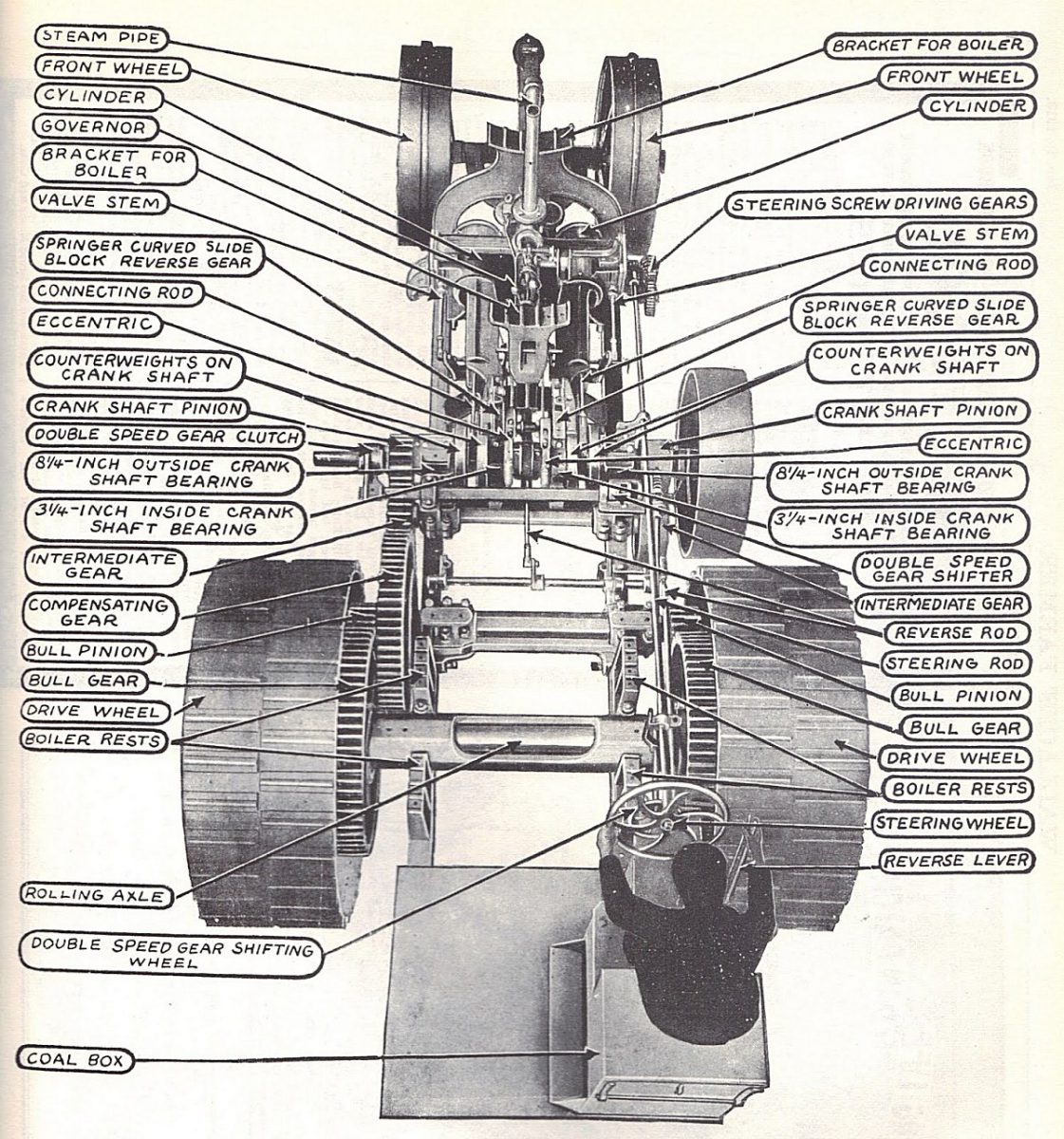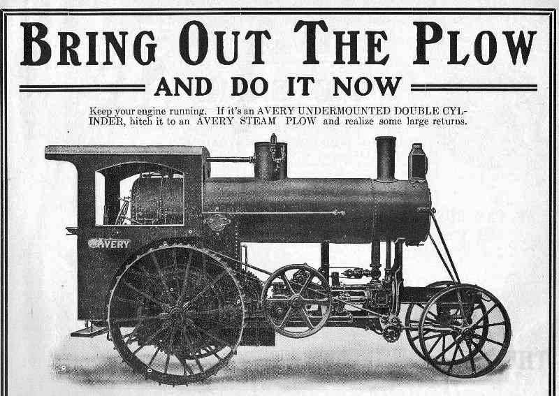 Avery Co. tenía una exitosa línea de motores de tracción a vapor, incluido el famoso modelo de motor bicilíndrico inferior Avery, llamado así porque tenía un motor de doble cilindro en la parte inferior de la caldera y no en la parte superior como los de la competencia. Este motor a vapor estaba catalogado como 40-120 CV y es de 1911.