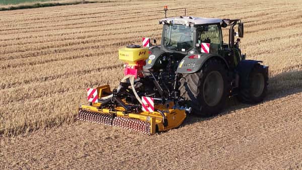 -CoverSeeder-MÜTHING: se trata de una rastra premontada genera tierra fina y mejora la distribución de la paja. A continuación, gracias a la gran potencia de succión del rotor, una trituradora desmenuza la paja y los rastrojos y despeja la superficie destinada a la siembra de los residuos de la siembra que se encuentran cerca del suelo. Toda esta mezcla creada de este modo pasa a la barra de siembra siguiente, que deposita los granos sobre la superficie aclarada. Una vez esparcida y cubierta la semilla, un rodillo de arrastre genera el contacto necesario con el suelo para una buena germinación.