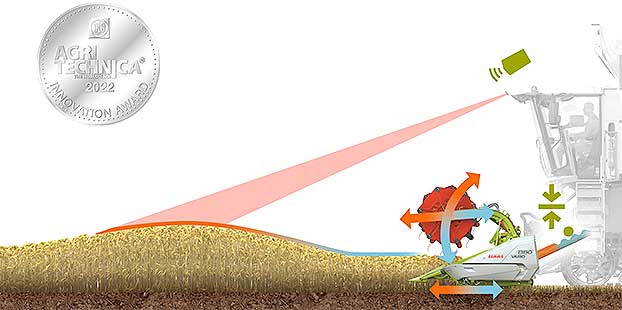 -CEMOS Auto Header-CLAAS: se trata de una tecnología de control de ajuste. Un escáner láser registra continuamente la altura del cultivo. Después de que el operador haya fijado la profundidad del molinete en el cultivo y la posición horizontal deseadas, los valores se van ajustando automáticamente a medida que cambia la altura del cultivo. El sistema detecta las sendas/los carriles, así como la línea de final del cultivo, llegando incluso a meter en el sinfín de alimentación los manojos de grano que caen de la mesa de corte.