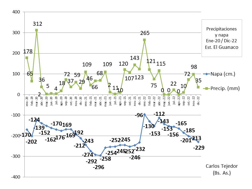 Respecto al impacto de las lluvias en las lagunas del Partido de Carlos Tejedor la SR de Tejedor destaca que “Las bajas lluvia, las altas temperaturas y los vientos generaron una bajante en todo el Partido. Por ejemplo, en la estación El Guanaco (zona Drysdale), en enero de 2022 la napa estaba a 96 cm de profundidad y en diciembre 2022 pasó a 229 cm de profundidad con un perfil totalmente seco”.