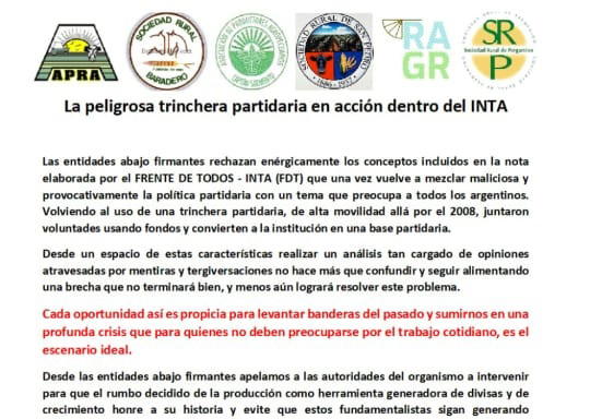 «Apelamos a las autoridades del organismo (el INTA está presidido por Susana Mirassou) a intervenir para que el rumbo decidido de la producción como herramienta generadora de divisas y de crecimiento honre a su historia y evite que estos fundamentalistas sigan generando enfrenamientos y retrocesos», señalaron las entidades.