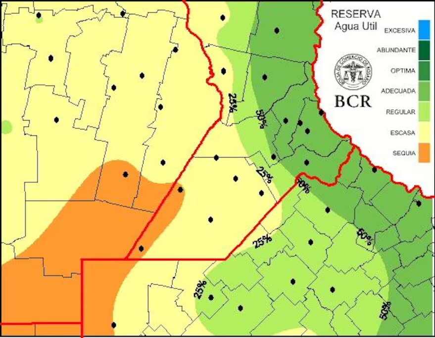 La reserva de agua útil en la zona núcleo para la siembra. Los colores amarillo a naranja indican déficit