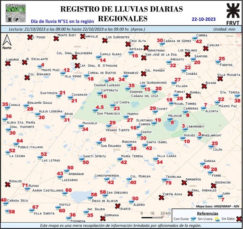 Por ejemplo, en el centro oeste de Santa Fe, como en San Jorge, cayeron casi 80 mm y en el sur santafesino el milimetraje fue interesante. En Carcarañá llovieron 35, en Bombal 50, en en Chabás 22, en Cañada de Gómez 25, Roldán 40, en Venado Tuerto 29, en María Teresa 43, en Hughes 15 mm y en Villa Cañás 34. Lo curioso es que en Teodelina cayeron 79mm. Por su aprte, en la región centro de la provincia redondeó unos 40 mm de promedio.