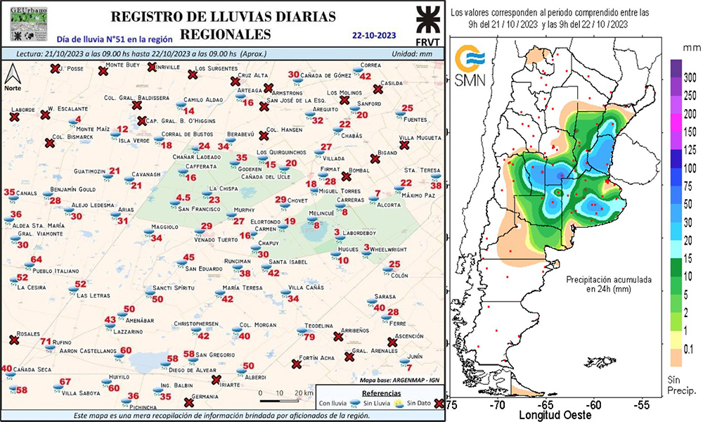 En el oeste bonaerense, se puede observar que en Gral. Villegas llovieron 20 mm, en Piedritas 35, en Santa Eleodora 50. En Junín apenas 7 mm y
