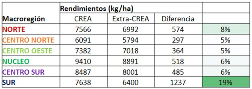 En soja de primera, las diferencias van desde cero en la macro-región Centro Norte, hasta 19% en el Centro Oeste. En soja de segunda, desde 8% en la macro-región Centro Oeste, hasta 28% en el Sur. En girasol, el cultivo con mayor variabilidad en las diferencias de rendimiento, las mismas van desde el 1% en la macro-región Centro Sur hasta 24% en el Sur. En trigo, el cultivo donde se observaron las mayores diferencias de rendimiento entre CREA y extra-CREA, las diferencias van desde 12% en la macro-región Centro Norte hasta 39% en el Sur.