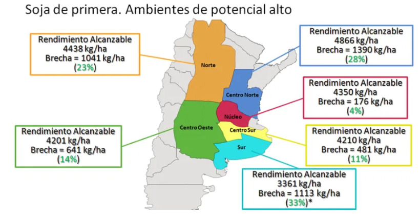 “En el caso, por ejemplo, de soja de primera en ambientes de alto potencial, la brecha reducible es de 4% en la macro-región núcleo, lo que muestra que la mayor parte de los empresarios están optimizando de manera eficiente el uso de los recursos en esos ambientes”, remarca José. “Sin embargo, en las macro-regiones Centro Norte y Sur la brecha se ubica alrededor del 30%, evidenciando un mayor margen para incrementar los rendimientos de soja de primera en esas zonas”, apunta.