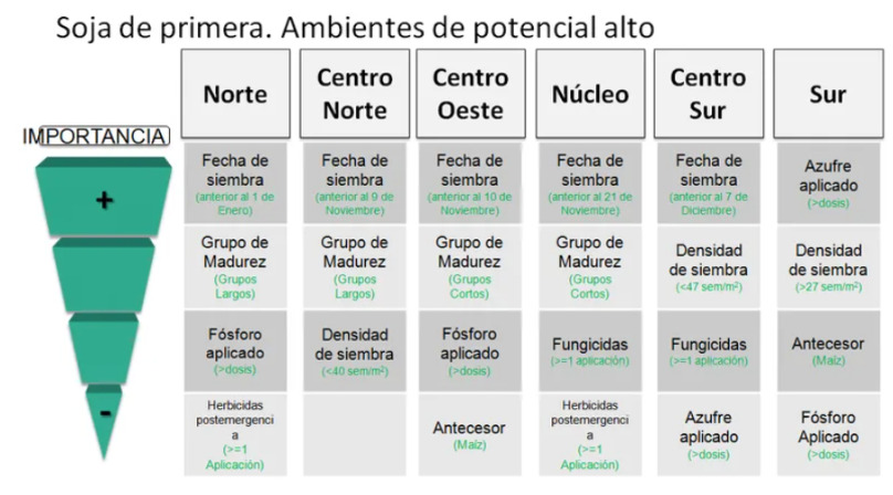 Respecto a las causas principales que generan las brechas de productividad, los primeros análisis permiten evidenciar algunas señales de cuáles son las principales variables de manejo que estarían involucradas. Para cada región, tipo de cultivo y ambiente se identificaron las variables de mayor relevancia al comparar el manejo de los lotes que obtuvieron rendimientos cercanos al alcanzable con el manejo de los lotes que obtuvieron valores alrededor del promedio.