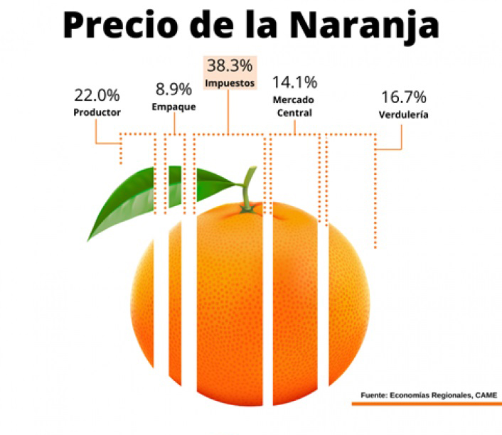 La naranja, otra víctima de los impuestos. Un estudio del sector de Economías Regionales de la Confederación Argentina de la Mediana Empresa (CAME), analizó la composición del precio del kilo de naranjas, desde la salida de la finca hasta que llega a la mesa. Ese trabajo nos permite inferir que por cada kilo de naranjas que compra un juninense, el 38,3% son impuestos.