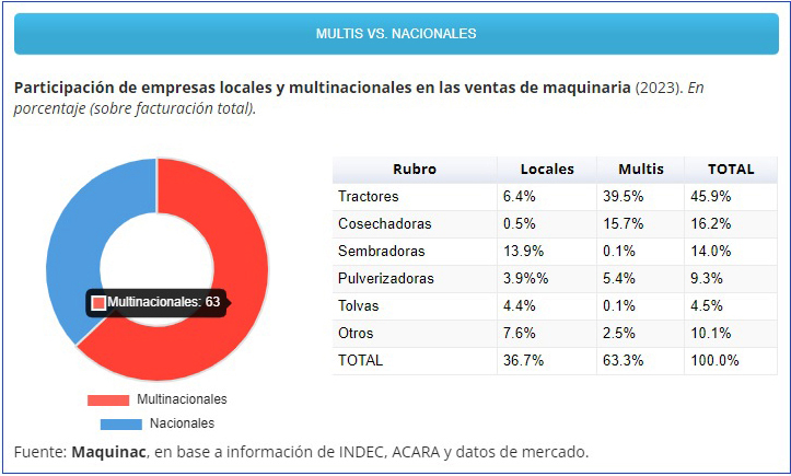 Según destaca un informe de la web maquinac.com, las empresas multinacionales lideran con comodidad en segmentos claves, como tractores, cosechadoras y picadoras de forraje. Explican que hasta 2022, el mercado de las maquinarias se repartía en 50-50.