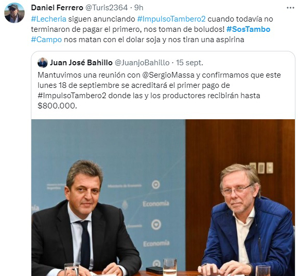 En este marco, productores utilizaron las redes sociales para indicarle al Secretario de Agricultura que “Siguen anunciando Impulso Tambero 2, cuando todavía no terminaron de pagar el primero. Nos toman de b…..!”, y agregó: “Nos matan con el Dólar Soja y nos tiran una aspirina”, cerró un tambero enojado.