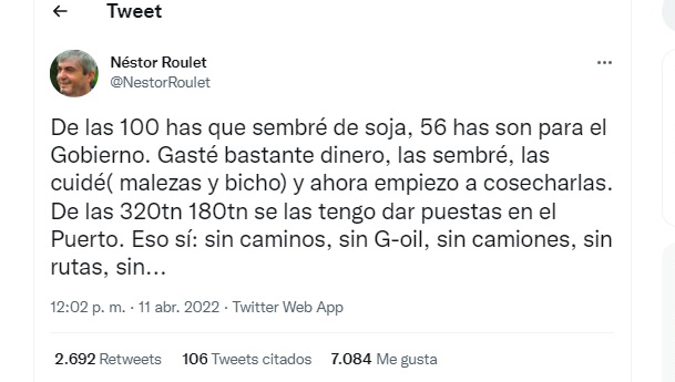 El productor agropecuario Néstor Roulet cuestionó en Twitter la política impositiva del Gobierno y se hizo viral. Aseguró que, de 100 hectáreas sembradas, 56 son para el Estado en concepto de retenciones e impuestos.