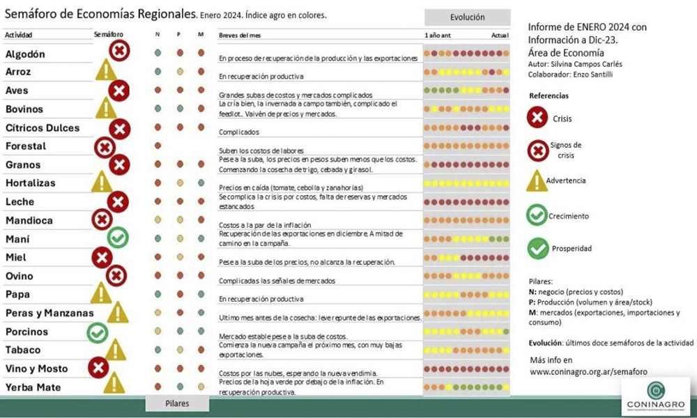 La Confederación Intercooperativa Agropecuaria Limitada, más conocida por sus siglas CONINAGRO, publica esta herramienta para que los productores agropecuarios puedan hacer un seguimiento de los indicadores que se analizan, con cifras que surgen del análisis realizado durante el mes de enero de 2024. El “Semáforo de Economías Regionales” del mes de enero muestra solo 2 verdes, 7 amarillos y 10 rojos. De esta manera, se sigue la tendencia de los semáforos anteriores.