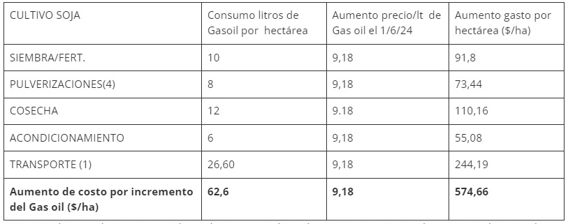 Vamos a calcular el aumento de costo por hectárea causado por el incremento del impuesto al gasoil para los tres principales cultivos del país (Cuadro 1,2 y 3) a partir del 1 de junio de 2024.