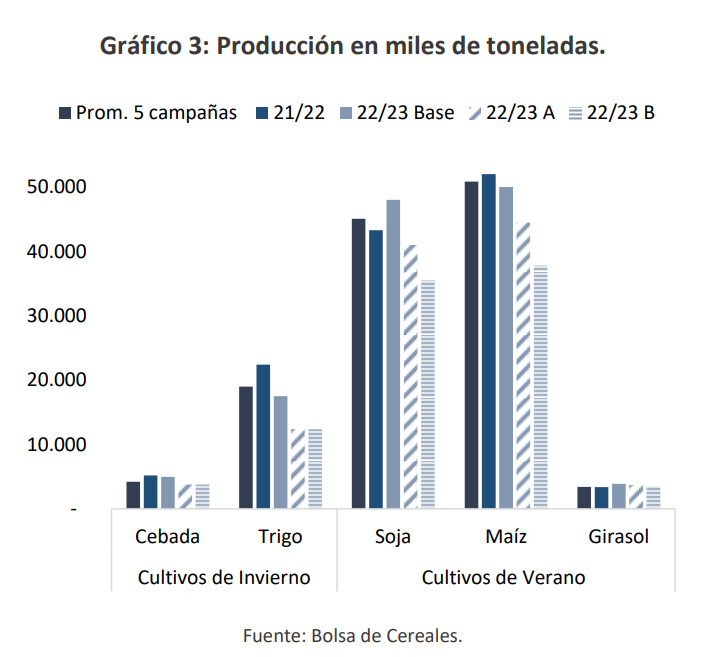 “Poniendo en contexto las dimensiones de estas pérdidas y, considerando las últimas proyecciones del FMI sobre el PBI de Argentina para el año 2023, que sería de US$ 643.797 millones, la caída del primer escenario es equivalente a 1,1% del PBI, mientras que el pesimista tendría un impacto negativo equivalente al 1,8%”, destacó la BCBA.