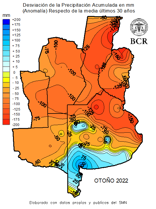 En Santa Fe faltan entre 100 y 150 mm para llegar las medias históricas de lluvias del otoño. En Córdoba la deuda es de 75 a 125 mm. Y en el 37% de Buenos Aires, en el noreste, el otoño 2022 le debe 100 a 150 mm para alcanzar los valores estadísticos de lluvias de la estación que cumple la función de recargar los suelos. Esta es una de las grandes causas de porqué el mapa de reservas de agua edáfica está en naranja y rojo —o sea seco y muy seco— en casi el 50% de la región pampeana.