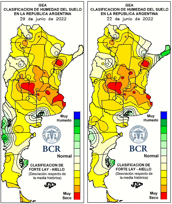 El posicionamiento que han tenido los centros de alta y baja presión han evitado las circulaciones que permiten el ingreso de aire húmedo desde el este. Esto no es casual, el Atlántico muestra un moderado enfriamiento en la costa argentina hasta el sur de Brasil que afecta negativamente la situación actual”. José Luis Aiello, doctor en Ciencias Atmosféricas, agrega que “los pronósticos de corto plazo muestran alguna actividad atmosférica en el inicio de julio, aunque modesta y con un comportamiento similar a las lluvias del final de junio. La primera década del nuevo mes no provocaría grandes cambios en el régimen de precipitaciones.