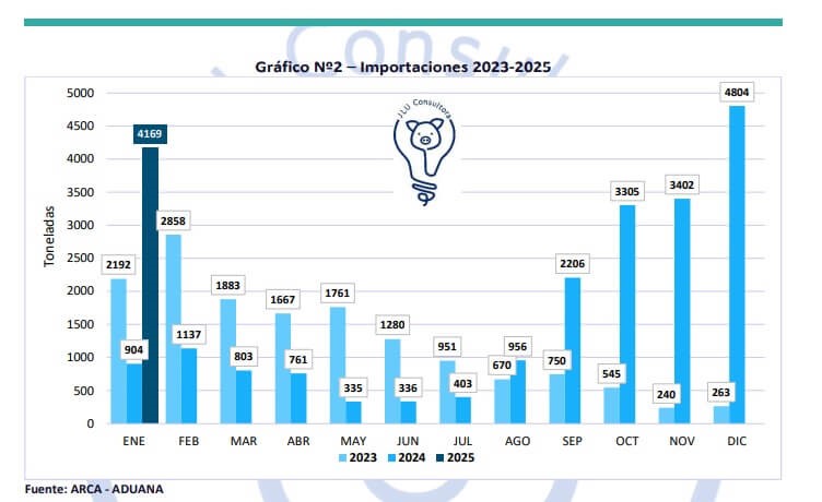 Además, puntualizó que las importaciones siguen con volúmenes muy altos: solo en enero ingresaron 4.169 toneladas, apenas un 13,3% menos en comparación al récord de diciembre 2024, cuando se compraron 4.804 toneladas.