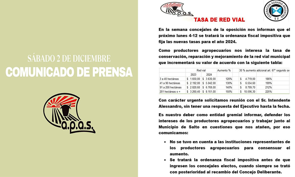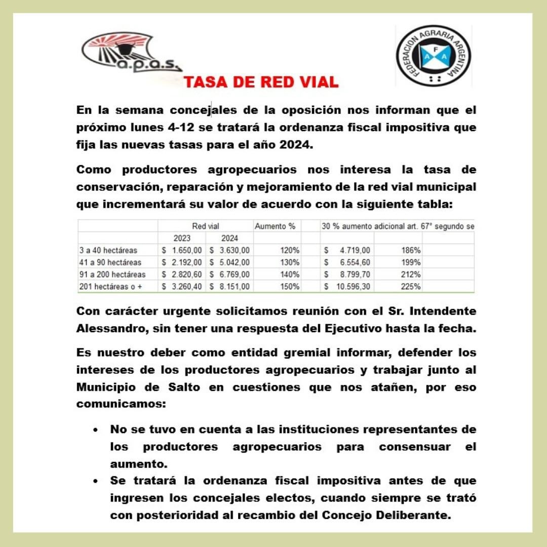 Según publicó en su cuenta de Instagram la Asociación de Productores Agropecuarios de Salto, el Concejo Deliberante intentará aprobar un incremento de hasta 225% el valor de la tasa de mantenimiento de la Red Vial. Cuestionan además que el debate se haga antes de que asuman los nuevos ediles.