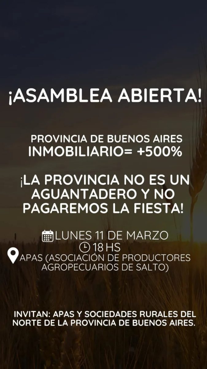 “¡La provincia no es un aguantadero y no pagaremos la fiesta!”, rezaba el texto de la convocatoria a la asamblea abierta, que se realizó en el predio de la Asociación de Productores Agropecuarios de Salto (APAS).
