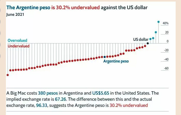 De acuerdo con los números de The Economist el peso argentino está subvaluado un 30,2% contra el dólar. La publicación destaca que el Big Mac cuesta $ 380, contra US$ 6,65 que sale en los Estados Unidos. Así, la tasa de cambio implícita es de $ 67,26 por dólar, contra los $96,33 por dólar que se ve en las pizarras de las casas de cambio argentinas.