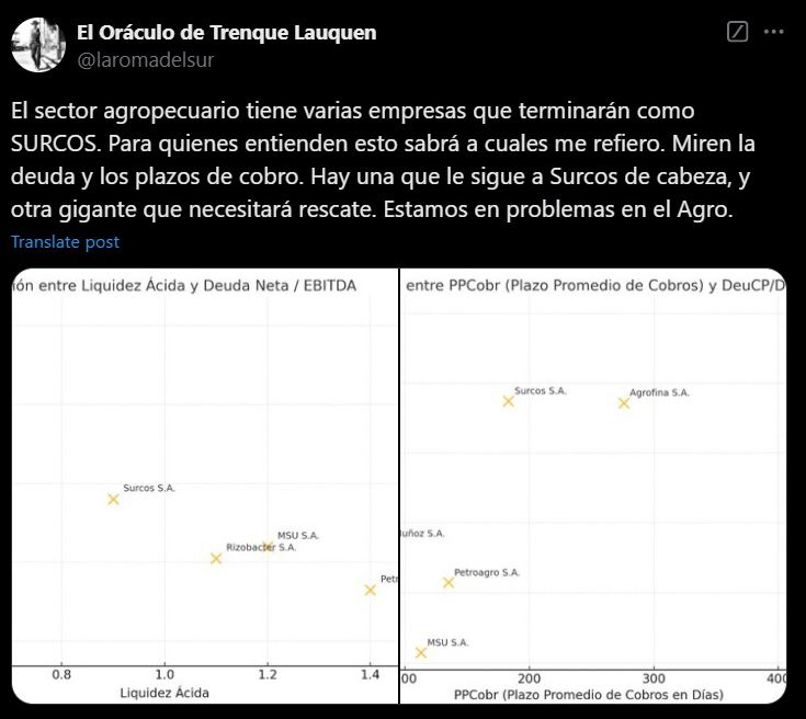 “El sector agropecuario tiene varias empresas que terminarán como SURCOS. Para quienes entienden esto sabrá a cuáles me refiero. Miren la deuda y los plazos de cobro. Hay una que le sigue a Surcos de cabeza, y otra gigante que necesitará rescate. Estamos en problemas en el Agro”, destacó en la red social X el usuario @laromaselsur y aportó dos cuadros explicativos.
