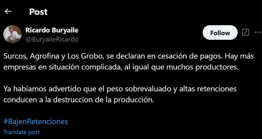 En medio de este tembladeral, se mezclan análisis financieros más o menos precisos con elucubraciones o conjeturas varias, en algunos casos teñidas por la política. “Surcos, Agrofina y Los Grobo, se declaran en cesación de pagos. Hay más empresas en situación complicada, al igual que muchos productores. Ya habíamos advertido que el peso sobrevaluado y altas retenciones conducen a la destrucción de la producción. #BajenRetenciones”, posteó el ex dirigente de CRA que fuera Ministro de Agricultura y dos veces diputado nacional por la UCR Ricardo Buryaile.