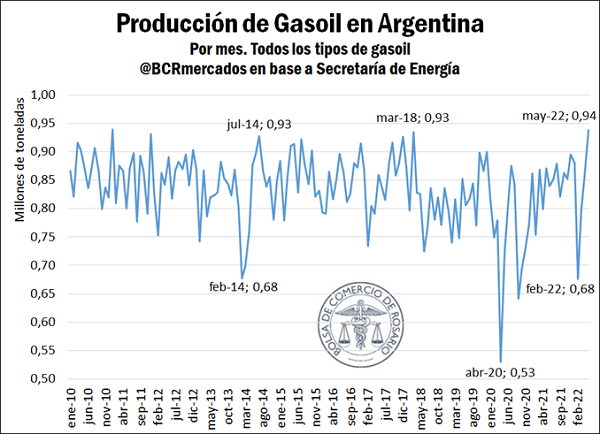 Primeramente, la producción de gasoil en Argentina se mantiene prácticamente sin cambios respecto a 2021, considerando el acumulado de los primeros cinco meses del año. Osciló en 4,1 millones de toneladas. Sin embargo, el nivel de producción mensual de enero a mayo del 2022 estuvo marcada por una fuerte volatilidad. «Como oportunamente destacamos en una edición anterior de este Informativo Semanal, la generación de gasoil en Argentina en febrero de este año fue la más baja desde 2014, sin computar la pandemia», destaca el último informe elaborado por la Dirección de Informaciones y Estudios Económicos.