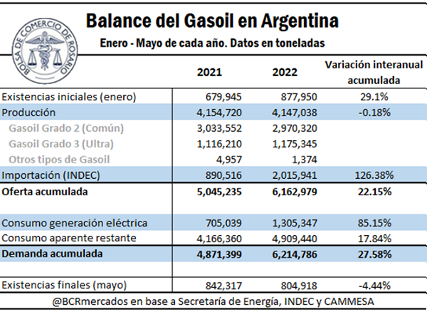 Por una parte, la demanda de gasoil para generación de energía en estos primeros cinco meses del año se incrementó con fuerza, pasando de representar el 14% -en el 2021- a más del 21% del consumo nacional de gasoil en el 2022. La falta de gas natural para generar energía estimuló un alza en el uso de gasoil para dicha producción.