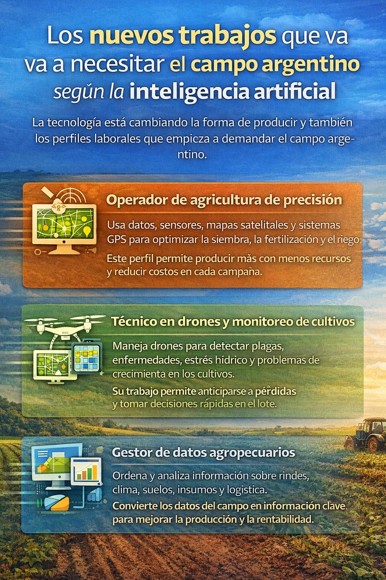 De acuerdo con estas proyecciones de inteligencia artificial, ya no se trata solo de fuerza de trabajo o conocimiento empírico: el campo argentino comienza a necesitar técnicos, operadores especializados y perfiles capaces de interpretar información en tiempo real. En ese escenario, estos son tres trabajos nuevos —o reconvertidos— que ganarán cada vez más protagonismo, según la IA.