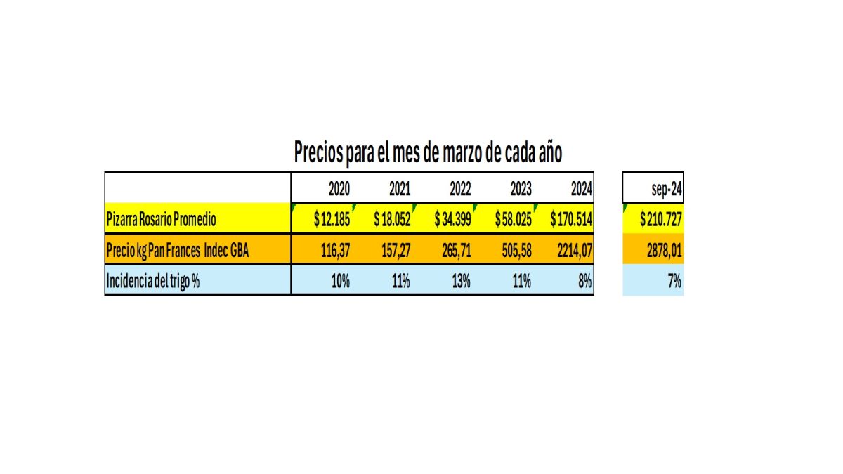 Finalmente, un usuario de X, de nombre Jorge Domínguez (@jordobra), se tomó el trabajo de evaluar la incidencia del trigo en promedio de la pizarra rosario sobre el promedio del precio del pan en una panadería del Gran Buenos Aires. La conclusión es que la incidencia del trigo sobre el precio del pan en 2020 era del 10%, en 2021 del 11%, en 2022 del 13%, en 2023 del 11%, durante este 2024 es del 8% y durante todo el mes de septiembre fue del 7%.