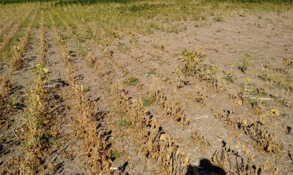 Se trata de los cultivos de soja que se sembraron en diciembre sobre lotes que tenían trigo o cebada. Ocurre que esos lotes fueron los más castigados por la seca; habida cuenta que el cultivo precedente se había llevado la poca humedad que existía en el suelo. Por lo que no solo se vio afectado el cultivo de granos finos, sino que ahora también afectó a la soja sembrada sobre ellos.