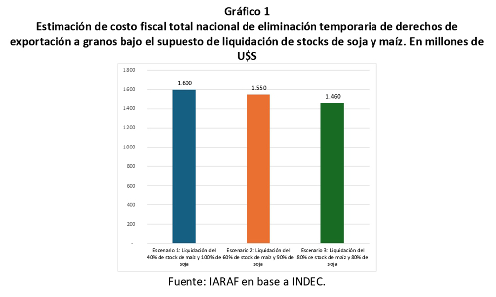 No obstante, si se usa como base la previsión de recaudación por derechos de exportación para los últimos cuatro meses del año que se incluyó en el Presupuesto 2026, el costo fiscal neto sería inferior, rondando los USD 1.000 millones.