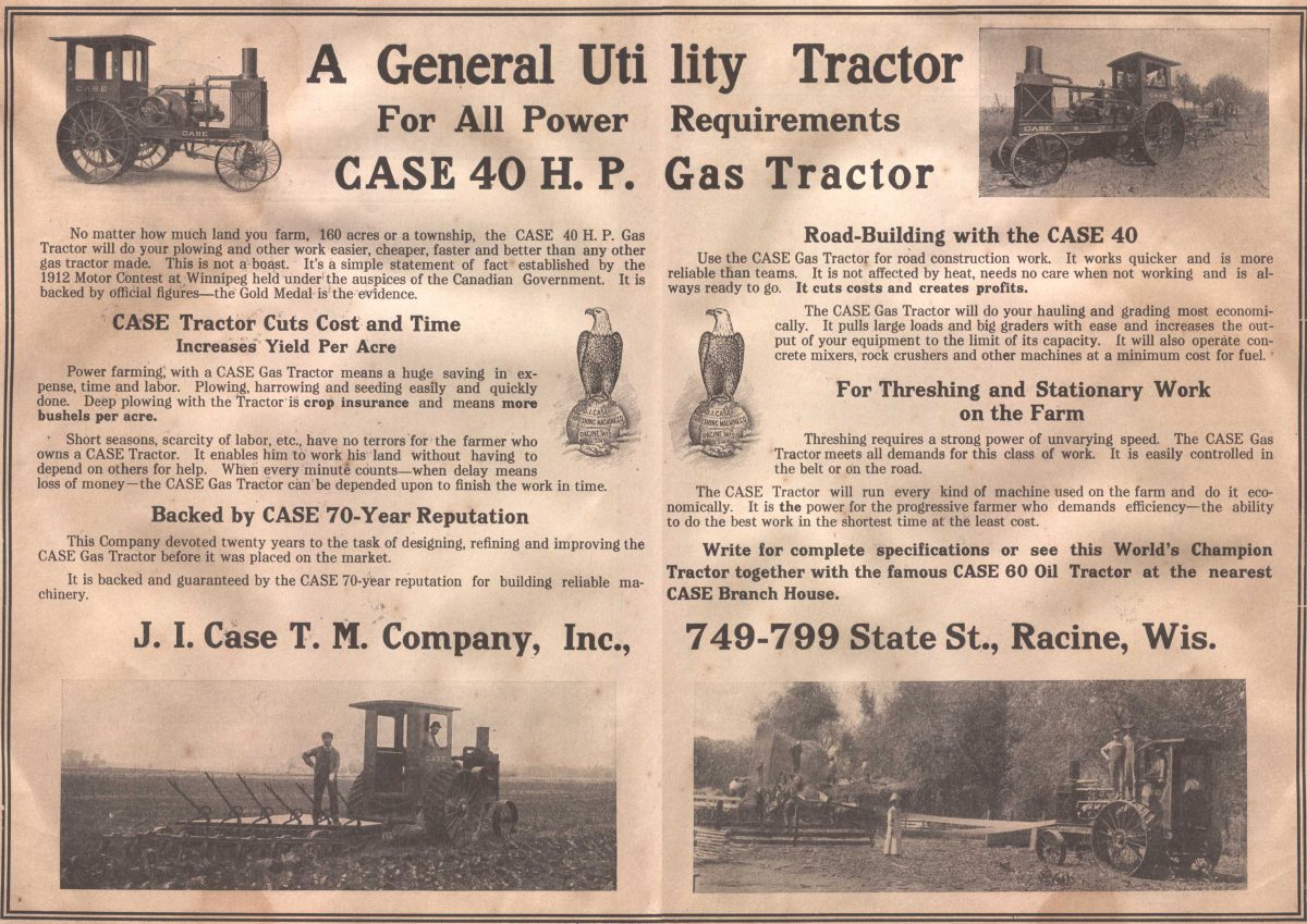 El folleto comienza diciendo: “No importa la cantidad de tierra que cultive, 160 acres o un municipio, el tractor a gasolina CASE 40 Hp, lo hará arar y trabajar de una forma más barata, más rápida y mejor que cualquier otro tractor que se haya fabricado”. Luego dice: “Potencie su agricultura con un tractor CASE, ahorre en gastos, tiempo y mano de obra”. Así presentaba CASE este nuevo modelo en 1912.