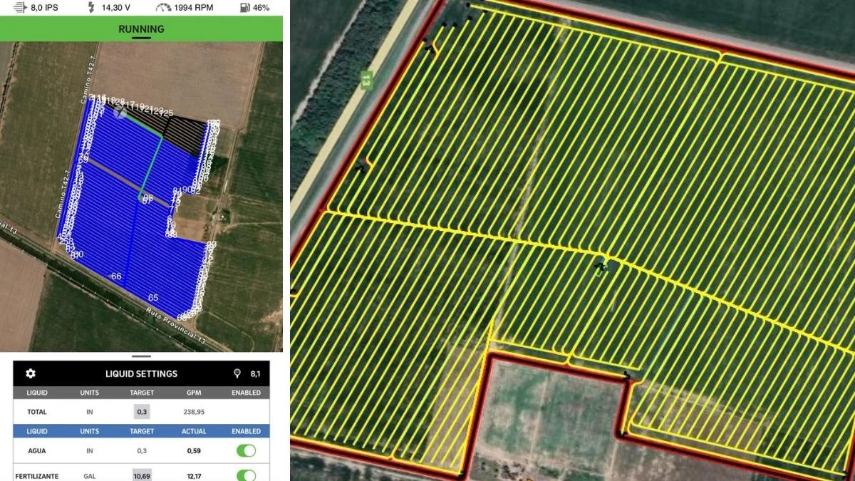El equipo funciona replicando el patrón de siembra gracias a un software que sincroniza el recorrido con la información generada por la sembradora. Esto permite aplicar el agua en la base de la planta y evita trabajar sobre suelo húmedo, lo que reduce huellas y compactación. “El software replica con precisión las pasadas y posiciona la salida en la base de las plantas”, describió Pérsico.