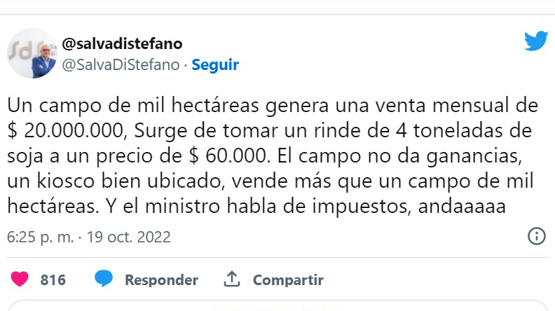 Di Stefano generó sorpresa cuando en medio de su pronóstico para el próximo año disparó que un quiosco factura más que un productor agropecuario. El planteo de «Salva» no es nuevo, pues hay un tuit de él que data del 19 de octubre pasado donde ya decía esto mismo.