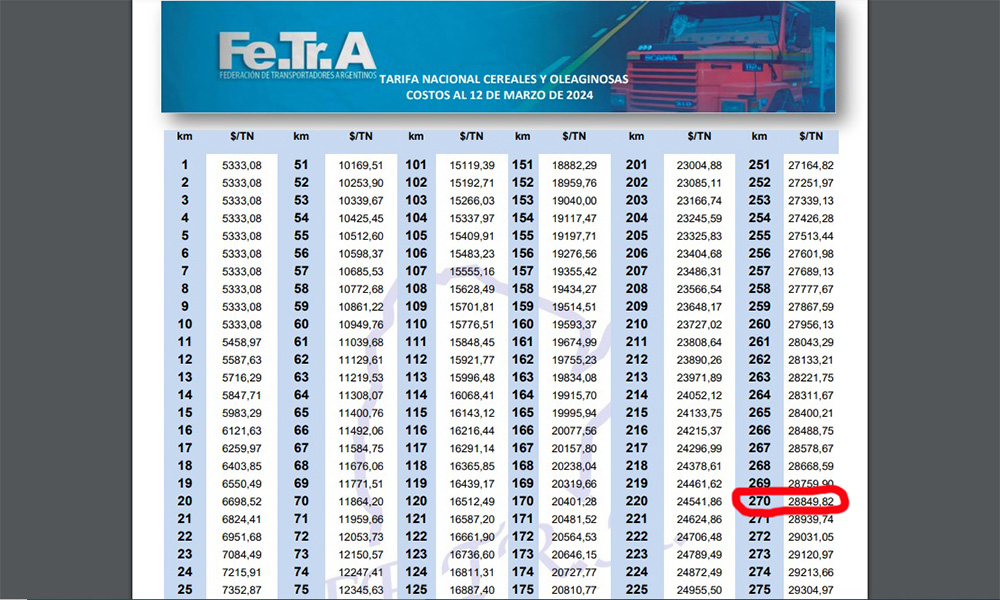 Esta nueva tarifa, que supone un valor de arranque de $ 5.333,08 por tonelada y kilómetro (gasoil grado 3 de referencia: $ 1.109), entró en vigencia el día de ayer.