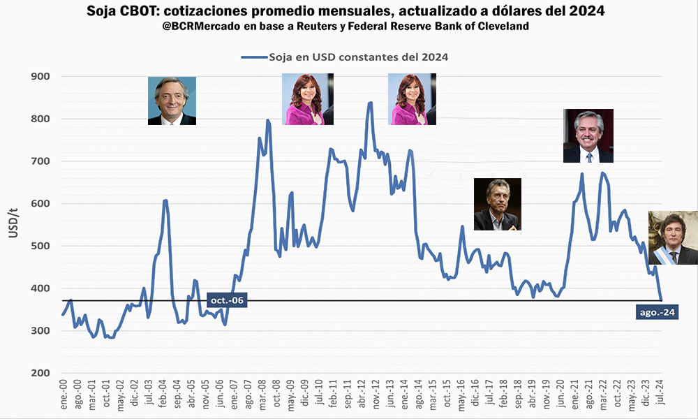 En este sentido, un trabajo económico de la Bolsa de Comercio de Rosario, reveló que si se actualiza el precio de la soja, esta tiene hoy el mismo valor que en 2006. Nada más ni nada menos que el mismo precio que hace 18 años.