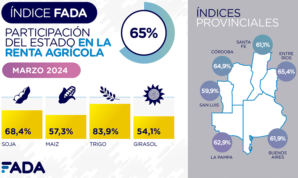 Fada (Fundación Agropecuaria para el Desarrollo de Argentina), acaba de publicar el nuevo informe trimestral. El mismo determinó que la participación del Estado, -en sus tres estamentos-, Nacional, Provincial y Municipal, se quedan con el 65% de la renta total. Es decir de cada $ 100 pesos que le quedan a un productos agrícola, el Estado se queda $ 65, cuando en diciembre pasado se quedaba con $ 59. Esto, lógicamente está dañando la renta agropecuaria.
