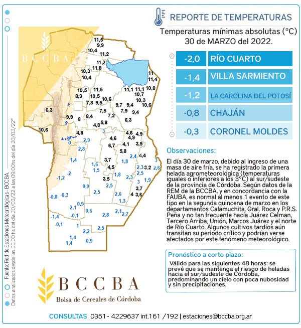 “Es normal al menos un evento de este tipo en la segunda quincena de marzo en los departamentos Calamuchita, Gral. Roca y Roque Sáenz Peña y no tan frecuente hacía Juárez Celman, Tercero Arriba, Unión, Marcos Juárez y el norte de Río Cuarto”, consignó el reporte de la BCCBA que a su vez publicó el siguiente ranking de temperaturas mínimas registradas en la provincia.