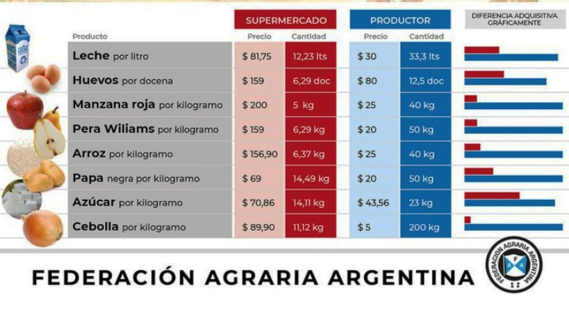 El relevamiento fue realizado por Federación Agraria Argentina (FAA), que a través de un informe buscó visualizar la problemática que atraviesan las economías regionales del país, mostrando “lo poco” que perciben sus producciones “y la enorme diferencia entre ese monto y el que pagan los consumidores en góndola”. “Los productores agropecuarios no somos formadores de precios, pese a que los funcionarios muchas veces intenten instalar ante la sociedad lo contrario”, señalaron desde la entidad.