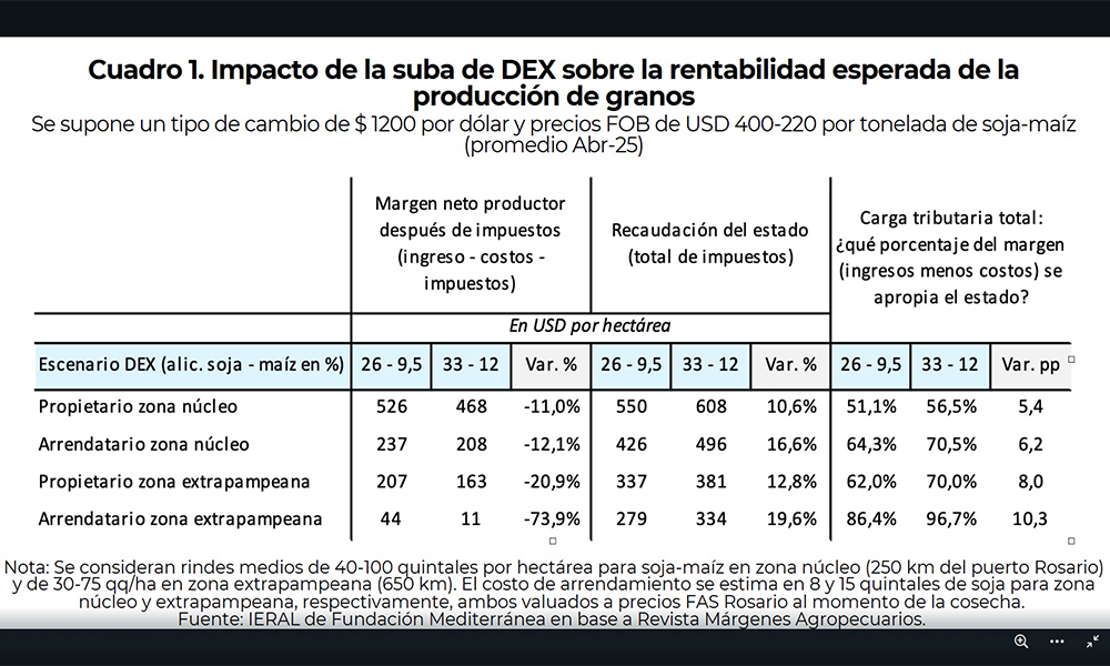 El informe comienza explicando que “al mes de junio un porcentaje no menor de la cosecha 2024/25 estará ya comercializada con la carga tributaria actual (como es habitual para la fecha) y sólo los granos que queden por venderse a partir de ese momento pagarán las mayores alícuotas (si resulta que se revierte la baja). Esto incide directamente sobre el resultado económico efectivo que tendrá el ciclo agrícola actual y también la potencial mayor recaudación que podría generar la reversión de la medida en el segundo semestre de este año”.
