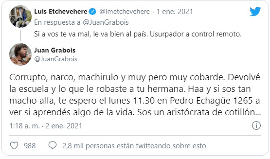 La réplica motivó otro picante mensaje de Grabois: «Corrupto, narco, machirulo y muy pero muy cobarde. Devolvé la escuela y lo que le robaste a tu hermana. Haa y si sos tan macho alfa, te espero el lunes 11.30 en Pedro Echagüe 1265 a ver si aprendés algo de la vida. Sos un aristócrata de cotillón…». (la dirección hace referencia a la sede de la CTPA, Confederación de los Trabajadores de la Economía Popular) ubicada en la zona de Constitución en la Ciudad Autónoma de Buenos Aires.