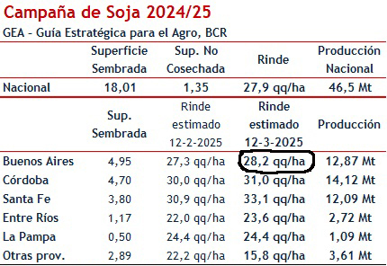 En el mismo se destaca que, “las lluvias llegaron recién en los últimos 10 días de febrero”, luego explica que “para entender el impacto de estos grandes eventos de lluvias, hay que distinguir las zonas que recibieron agua antes del 20 de febrero, las que se recuperaron después y las que no se recuperaron. En el caso de la franja central del país, el agua llegó para el llenado de la soja de 1ra y para la soja de 2da, el agua llegó un paso antes de iniciar su período crítico, a pesar de pérdidas irreversibles que ya había. Se estima en esa gran área un rebote de 4 qq/ha para el conjunto total de la soja. Pero hay una gran zona de Buenos Aires, el centro y el sur de la zona núcleo, en donde el agua llegó entre finales de febrero y los 1ros días de marzo, tras un estado de sequía que se venía extendiendo desde mediados de diciembre. Hay que considerar que por la sequía antes y por anegamientos ahora, en Buenos Aires podrían no recolectarse alrededor de 400.000 hectáreas sembradas con soja”.