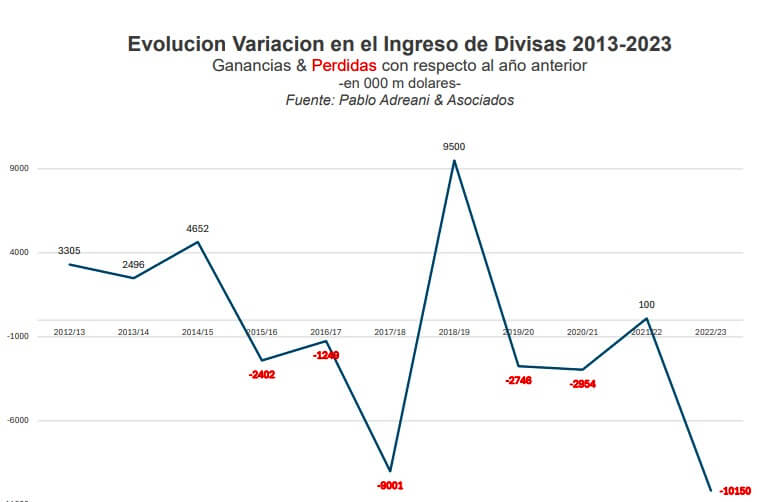 Adreani subraya que se trataría de divisas frescas que ingresarían en un período en donde las liquidaciones bajan –por una cuestión estacional- y permitiría realizar el empalme con la cosecha fina 2024/25 sin sobresaltos.