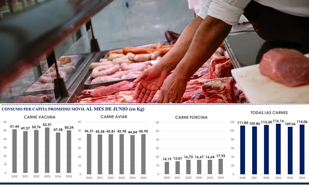 El dato, calculado como promedio móvil, incluye la suma del consumo de carne vacuna, aviar y porcina, y refleja una recuperación del consumo en un contexto económico desafiante.