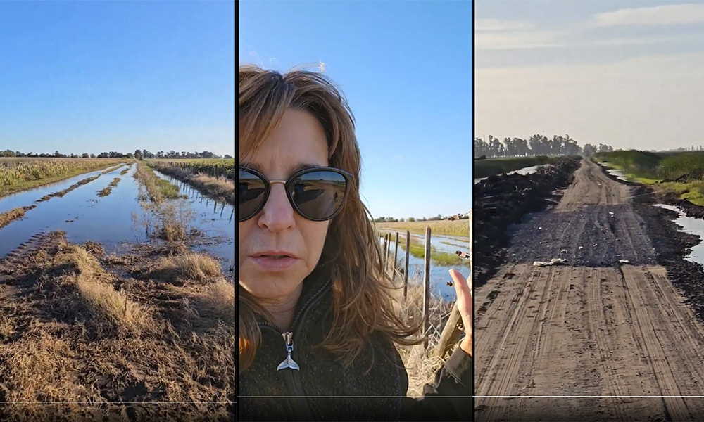 El último video lleva por título “Ruralidad abandonada al sur de Carlos Casares”. En el mismo muestra un camino a punto de cortarse con un lagunón de un lado y alteo de tierra del otro. “Acá está todo rebalsado, obviamente esta agua se reviene y empieza a comerse el camino. Y esta gran masa de agua ingresa de aquel lado. Por qué?, porque esto está plagado de canales ilegales. Por qué?, porque los señores de Hidráulica de la provincia son cómplices de todo este desastre junto con las autoridades de Carlos Casares…”, denunció la tambera.