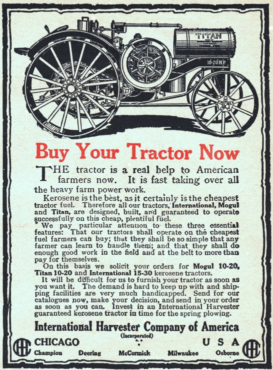 Fue pionera en la construcción de maquinaria con motores de combustión interna (Diesel). Los primeros tractores importantes de la IHC fueron los modelos Titán 10-20 y Mogul 15-30, aludiendo estos números a la potencia de barra de tiro y de polea respectivamente. Introducidos en 1915, los tractores (que fueron comparativamente pequeños respecto de sus antecesores) se usaron primeramente como herramientas de tracción para tirar de arados y para girar las correas que accionaban las trilladoras estáticas.