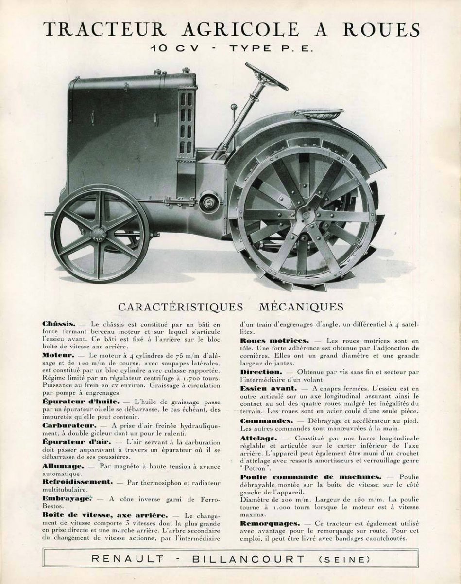 El legendario Renault PE fue introducido al mercado francés en 1926 y se dejó de fabricar trece años después, en el año 1939. Este modelo era un tractor ideal para los pequeños granjeros franceses, pues era liviano y eficiente.