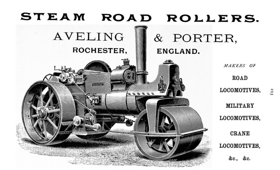La marca Aveling & Porter es famosa por haber fabricado las máquinas apisonadoras a vapor. Una enorme máquina propulsada a vapor que era muy utilizada para apisonar u emparejar caminos.