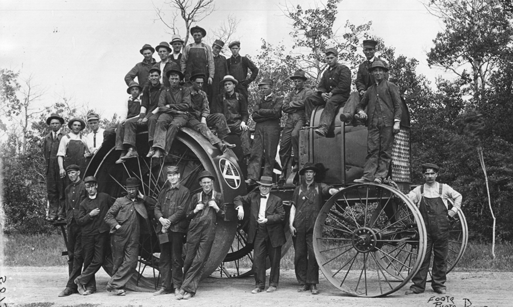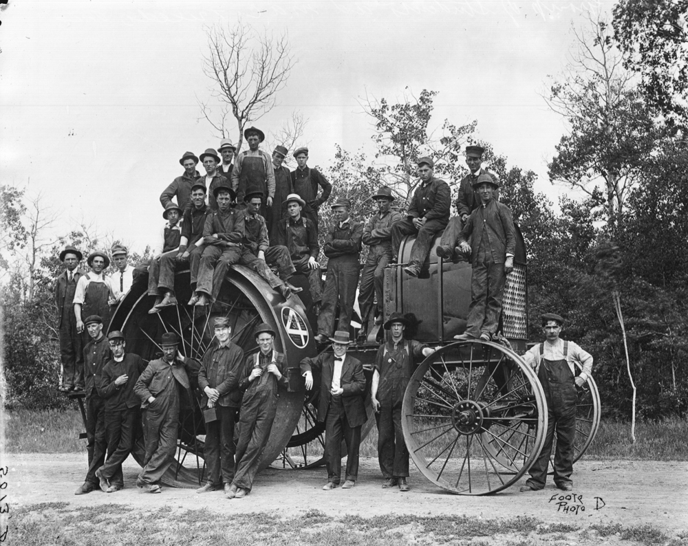 Esta foto es una rareza absoluta. Se trata del tractor modelo Big Four 30, el cual fue fabricado por la empresa Gas Traction Company de Minneapolis, Minnesota. Esta enorme máquina fue fabricada en 1908, siendo uno de los primeros tractores con motor a gasolina. Como se ve, el Big Four tenía un tamaño considerable, pues sus ruedas traseras median 8 pies de alto y 30 pulgadas de ancho. Fue el tractor más grande de su época y la mayor demanda de este modelo se generó en Canadá. El Big Four 30 podía tirar de un arado de hasta 10 rejas. Se estima que en los últimos 30 a 35 años, solo salió uno solo a la venta. Y como se ve, ya en épocas de cuando era nuevo, nadie quería perderse una foto con él.